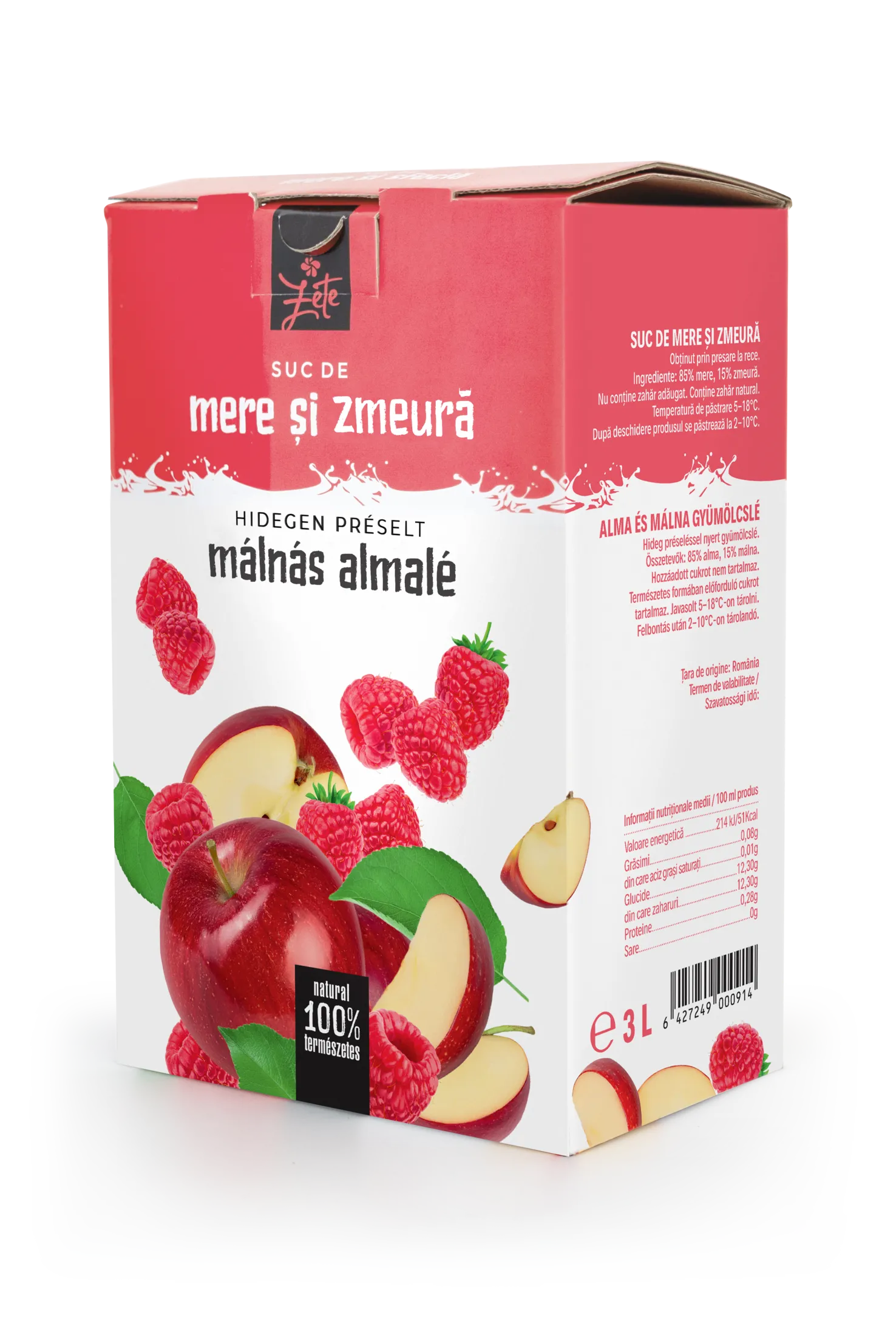 Pure natural 100% fresh apple&raspberry juice made of cold pressing, 85% apple and 15% raspberry giving a fantastic juicy and fresh flavour. Not from concentrate, cold pressed. It does not contain any added substances (no sugar, no preservatives, no E-numbers, no water, no artificial colors).